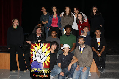 This is our speech team for 09. David and SP, another drama teacher, did a fine job with this group. It grew from last year and we were pleased with their progress. They were a great group of kids and did a great job of hosting other students. Anna is pictured on the top row and David in the front. They are "dressed down" because it was the last night banquet and we were tired!!